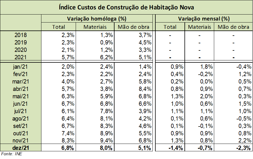Em dezembro de 2021, o índice de custos de construção de habitação nova registou um aumento de 6,8%, em termos homólogos, taxa que é inferior em 1,5 pontos percentuais ao registado em novembro, 8,3%.