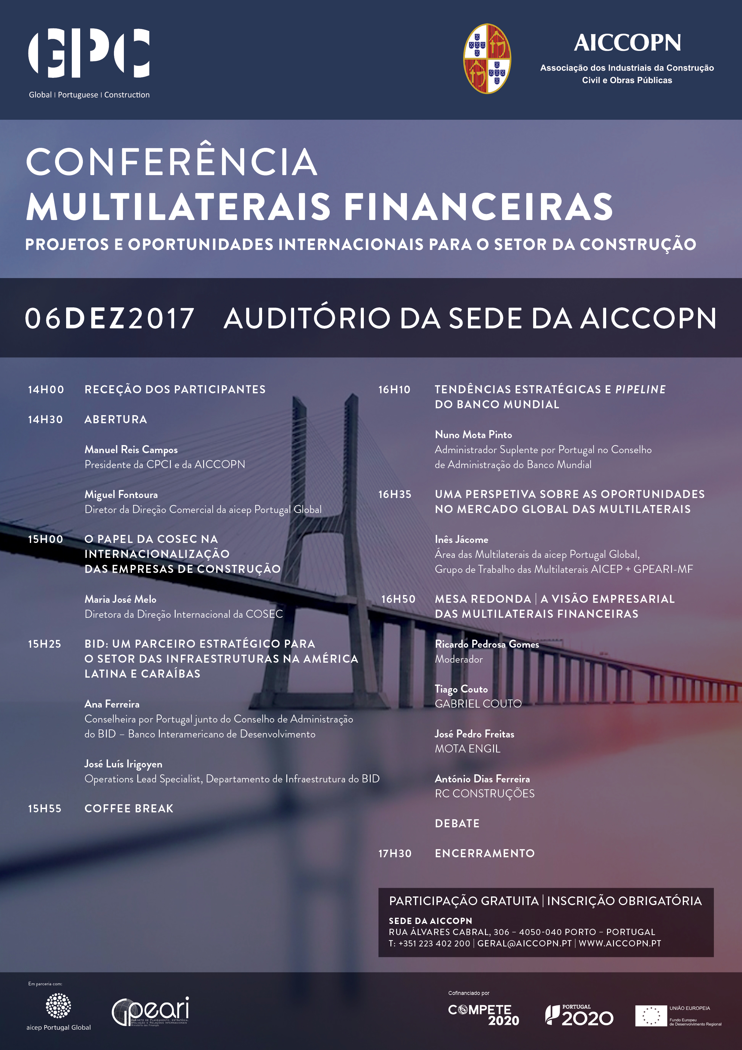 A AICCOPN, no âmbito do seu Projeto GPC – GLOBAL PORTUGUESE CONSTRUCTION, promove, em parceria com a aicep Portugal Global e o Gpeari – Gabinete de Planeamento, Estratégia, Avaliação e Relações Internacionais, a Conferência | MULTILATERAIS FINANCEIRAS – Projetos e Oportunidades Internacionais para o Setor da Construção, que tem lugar no Auditório da associação, no dia 06 de dezembro, com início às 14h30.