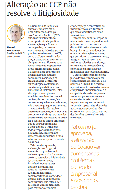 "A Assembleia da República aprovou, uma vez mais, uma alteração ao Código dos Contratos Públicos (CCP) que, invariavelmente, foi uma oportunidade perdida. As alterações que ficaram consagradas, passaram novamente ao lado dos grandes problemas estruturais do CCP, como o cálculo irrealista dos preços base, a falta de critérios obrigatórios e uniformes para identificação de propostas de preço anormalmente baixo, a diferenciação dos regimes de liberação das cauções consoante as obras sejam localizadas no Continente ou nas Regiões Autónomas, ou a interoperabilidade das Plataformas Eletrónicas (…)."