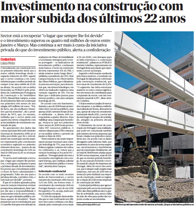 A notícia "Investimento na construção com maior subida dos últimos 22 anos" publicada hoje no Jornal Público, com referência aos dados fornecidos pela CPCI – Confederação Portuguesa da Construção e do Imobiliário, revela que o setor está, finalmente, a recuperar.