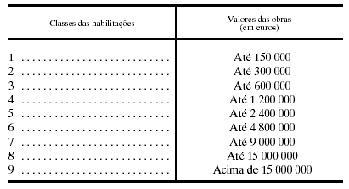 Foi publicada, no Diário da República n.º 242, I Série-B, de 20 de Dezembro, a Portaria n.º 1300/2005, que vem fixar a correspondência entre as classes em que são atribuídas as habilitações (categorias/subcategorias) contidas nos alvarás para o exercício da actividade da construção e o valor das obras que os seus titulares ficam habilitados a realizar, indicados no quadro seguinte:
