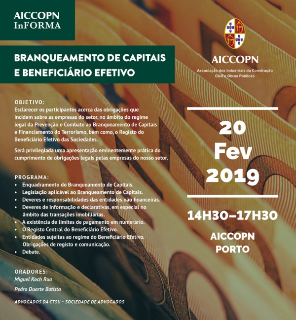 Realiza-se no próximo dia 20 de fevereiro, na Sede da AICCOPN, no Porto, uma Sessão AICCOPN InFORMA, que será dedicada ao tema Branqueamento de Capitais e Beneficiário Efetivo.
