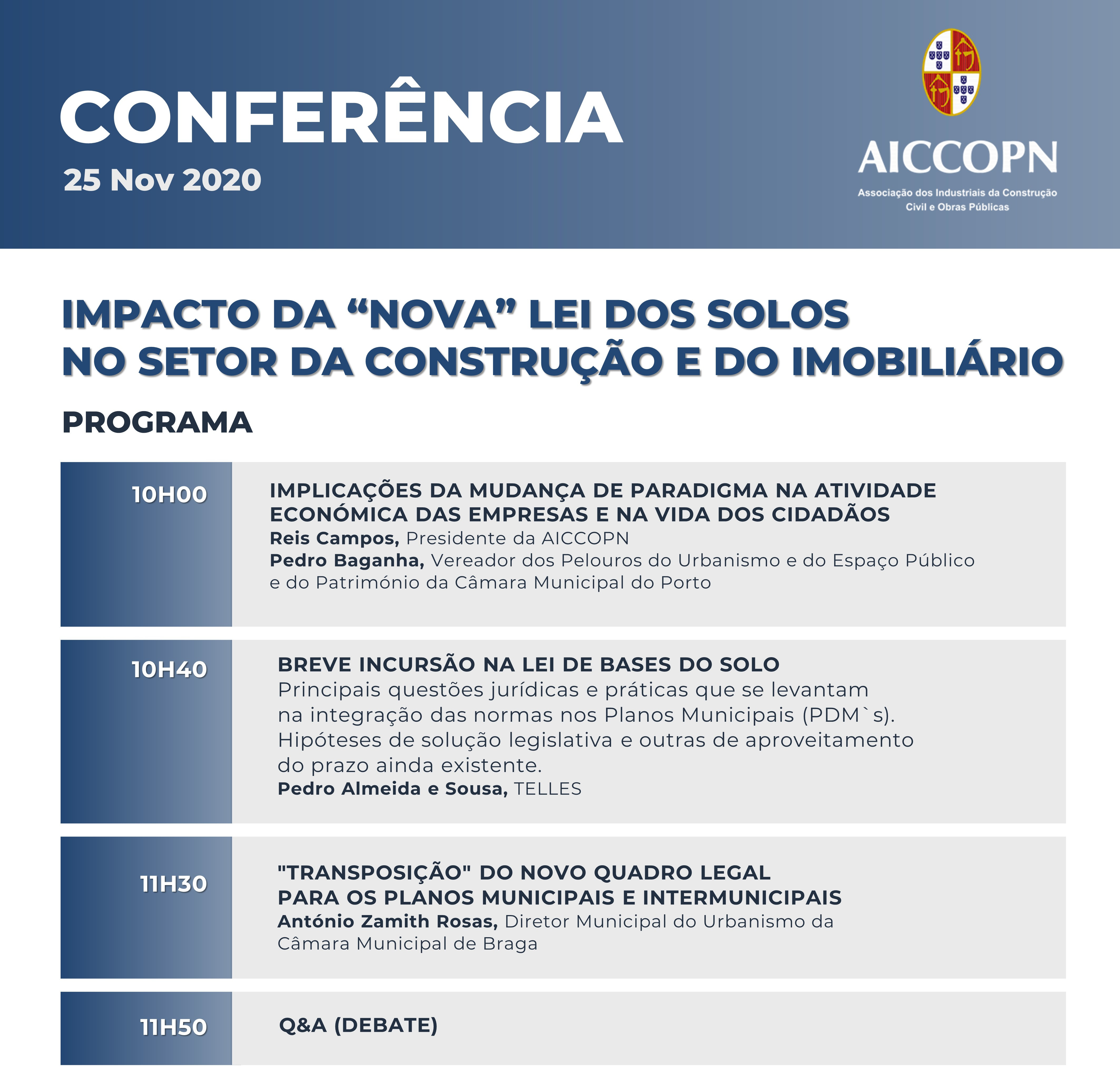 Tendo presente a relevância e a atualidade da temática respeitante à “nova” Lei dos Solos e com o intuito de abordar as principais implicações das normas relativas ao “uso” e “classificação” do solo na atividade económica das empresas e na vida dos cidadãos, a AICCOPN, em parceria com a TELLES, realiza, no próximo dia 25 de novembro, a Conferência, transmitida através da plataforma zoom, subordinada ao tema Impacto da "Nova" Lei dos Solos no Setor da Construção e do Imobiliário, cujo Programa pode ser consultado aqui.