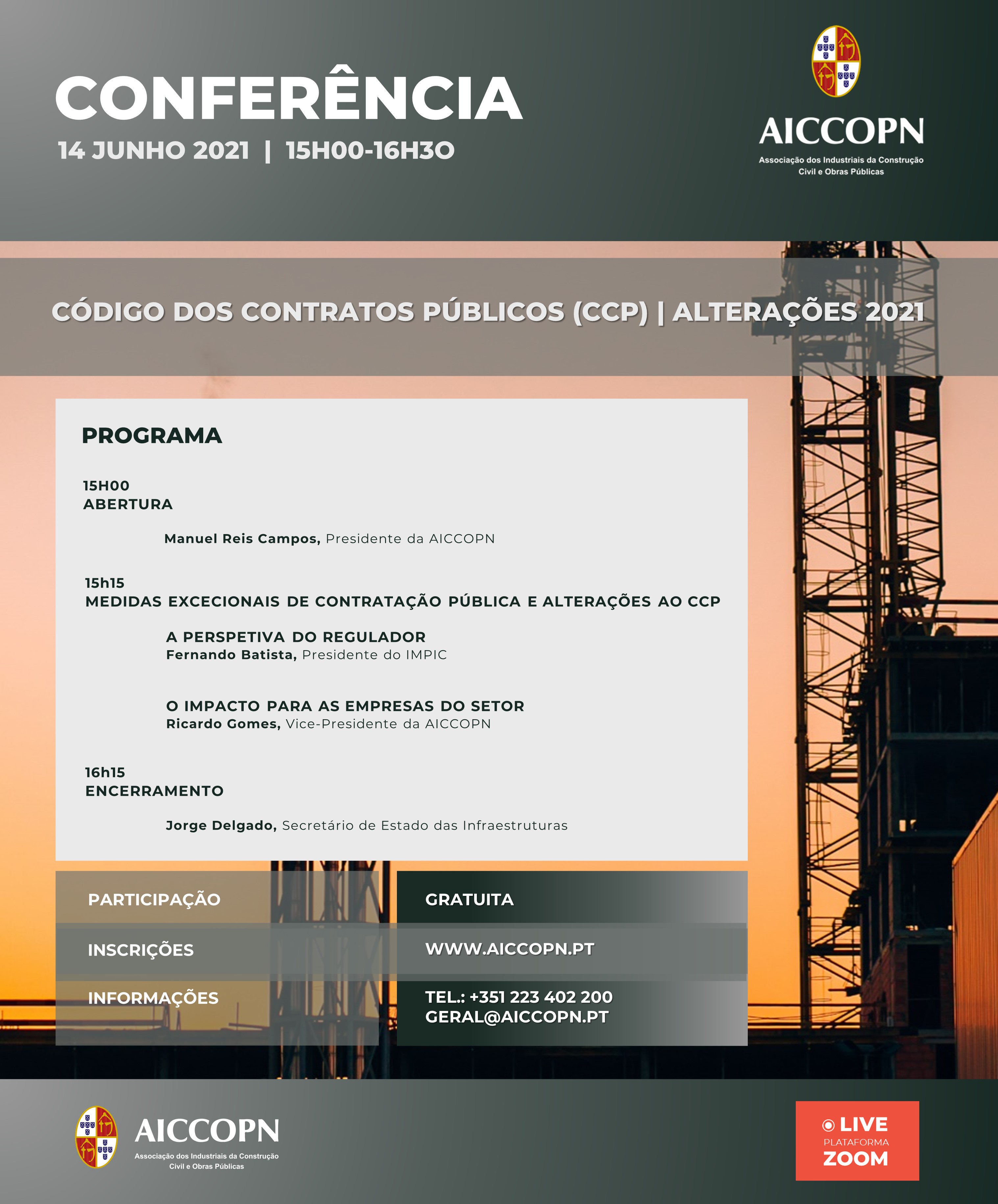 No seguimento da publicação da Lei n.º 30/2021, de 21 de maio que veio introduzir alterações ao Código dos Contratos Públicos (CCP), assim como aprovar medidas excecionais no âmbito da contratação Pública, a AICCOPN irá realizar no próximo dia 14 de junho, a Conferência | CÓDIGO DOS CONTRATOS PÚBLICOS | ALTERAÇÕES 2021, que conta com o Programa: