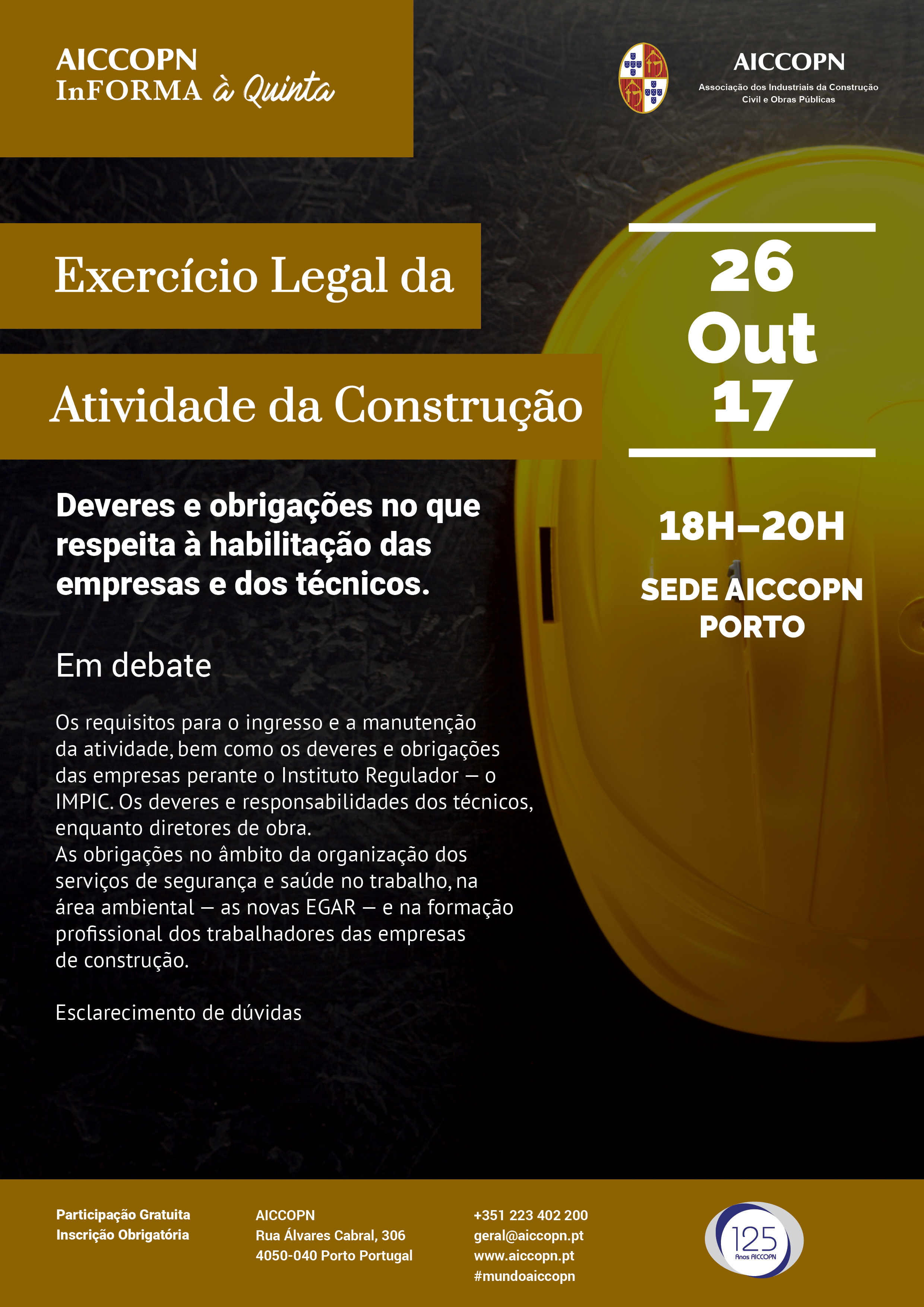 No âmbito do ciclo de sessões AICCOPN InFORMA à Quinta, estará em debate, dia 26 de outubro, com início às 18h00, o tema EXERCÍCIO LEGAL DA ATIVIDADE DA CONSTRUÇÃO.