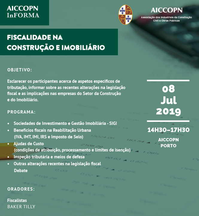 Realiza-se na Sede da AICCOPN, no Porto, no próximo dia 08 de julho, a sessão AICCOPN InFORMA que será dedicada ao tema "Fiscalidade na Construção e no Imobiliário"