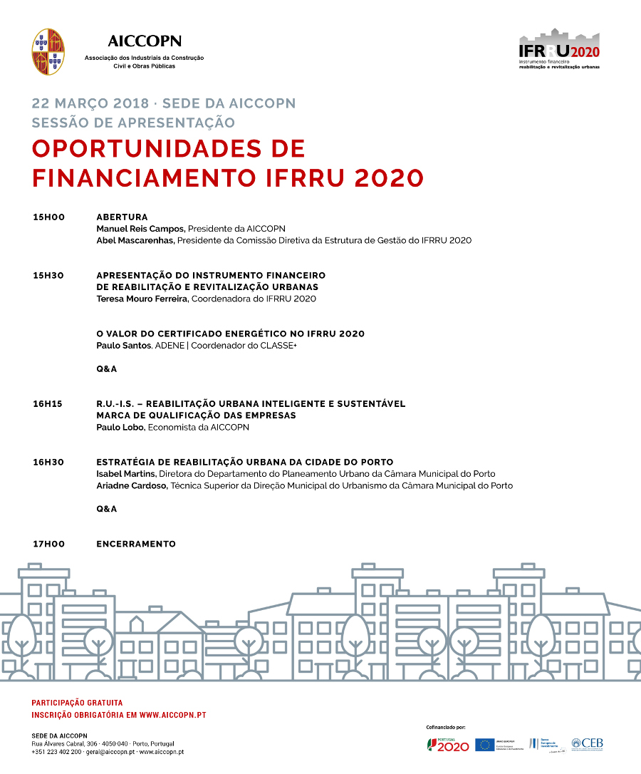 A AICCOPN promove, no próximo dia 22 de março, a Sessão de Apresentação | Oportunidades de Financiamento IFRRU 2020, que terá lugar na sua Sede, no Porto, com início às 15h00.