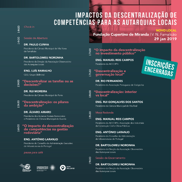 O Grupo Skillmind, em parceria com o Observatório das Autarquias Locais e com o apoio da Câmara Municipal de Famalicão, vai realizar uma conferência subordinada ao tema "Impactos da Descentralização de Competências para as Autarquias Locais", que terá lugar dia 29 de Janeiro, com início às 14h00, na Fundação Cupertino de Miranda de Vila Nova de Famalicão (Praça Dona Maria II).