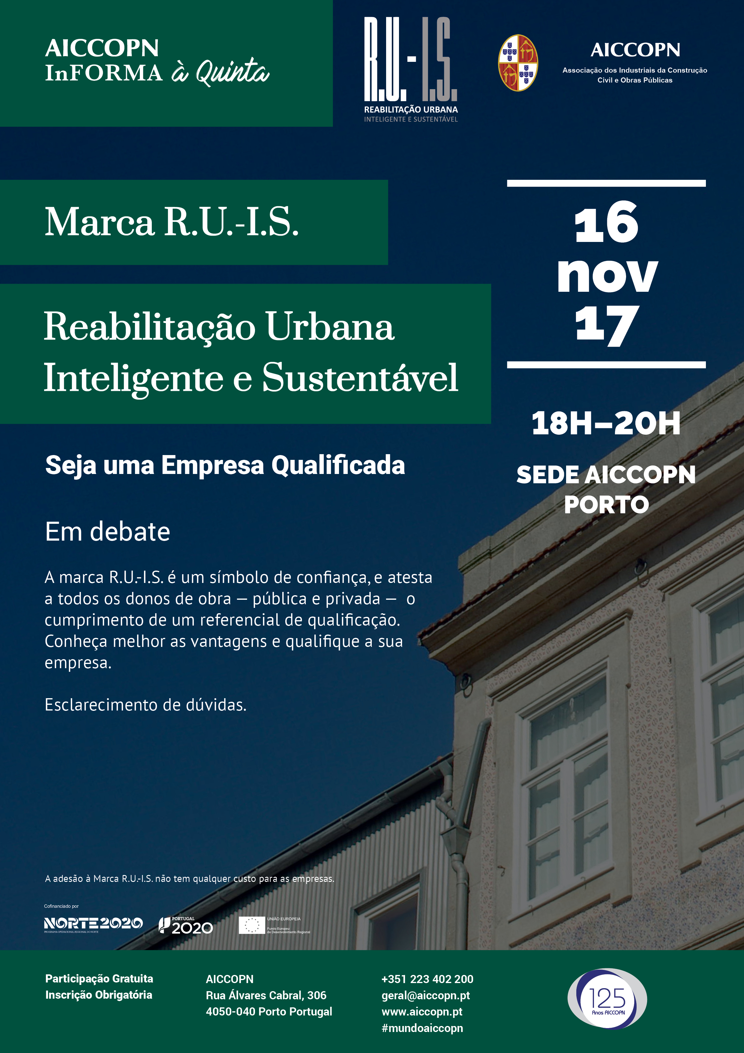 No âmbito do ciclo de sessões AICCOPN InFORMA à Quinta, estará em debate, dia 16 de novembro, com início às 18h00, a Marca R.U.- I.S. – Reabilitação Urbana Inteligente e Sustentável, Projeto da AICCOPN que conta com o apoio do Norte2020.