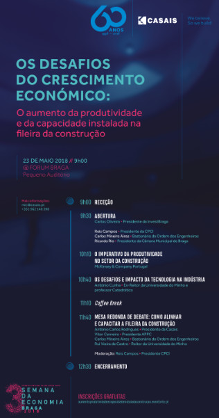 A AICCOPN associa-se e apoia institucionalmente o Seminário | OS DESAFIOS DO CRESCIMENTO ECONÓMICO – O aumento da produtividade e da capacidade instalada na fileira da construção, uma iniciativa realizada pela CASAIS, empresa Associada da AICCOPN, promovida no âmbito do seu 60º Aniversário.