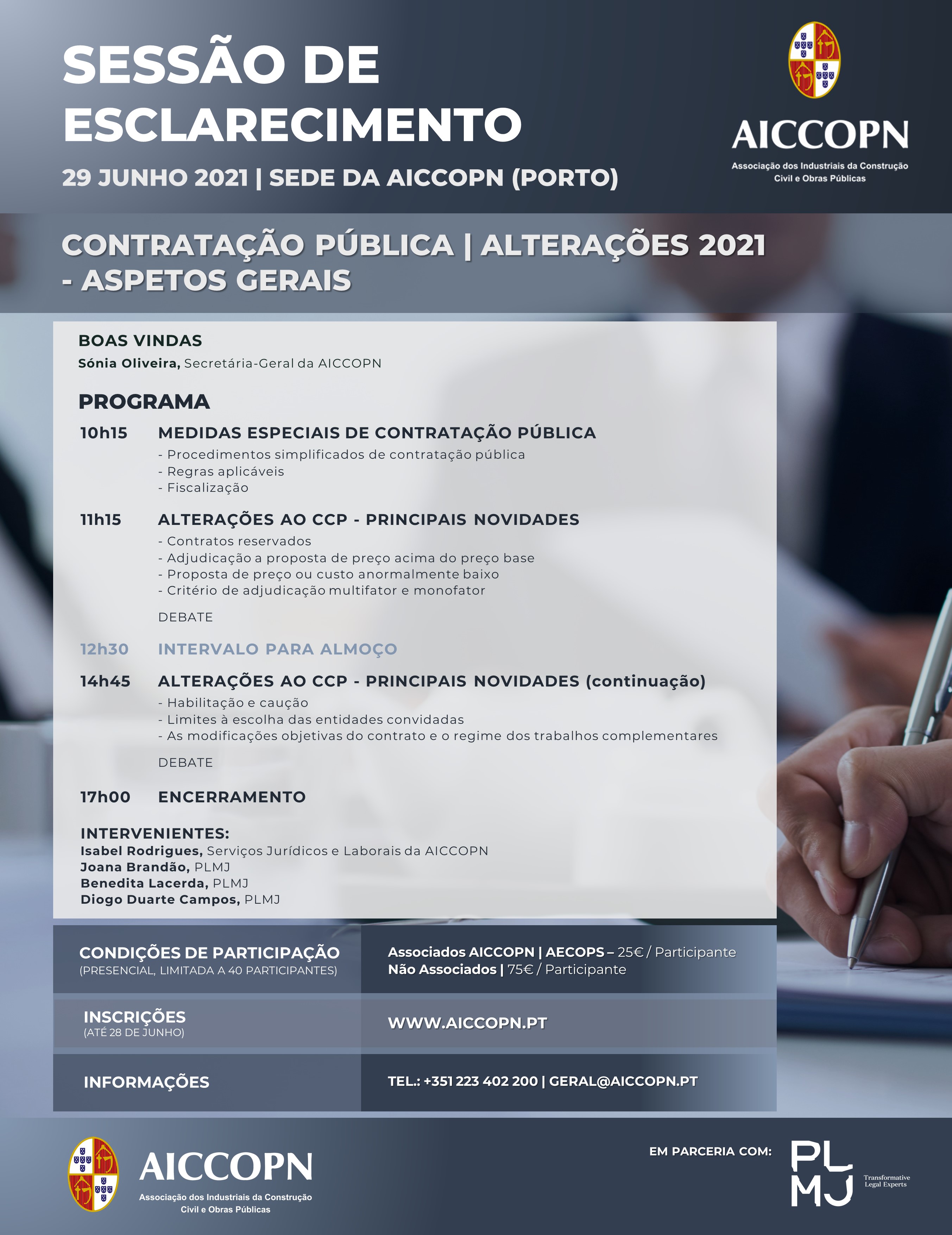 Na sequência da publicação da Lei n.º 30/2021, de 21 de maio que aprova medidas excecionais de Contratação Pública e introduz alterações significativas ao Código dos Contratos Públicos e, em especial, no domínio das Empreitadas, a AICCOPN, em parceria com a PLMJ, irá realizar no próximo dia 29 de junho, uma Sessão de Esclarecimento, na qual serão abordadas algumas das principais novidades do diploma.