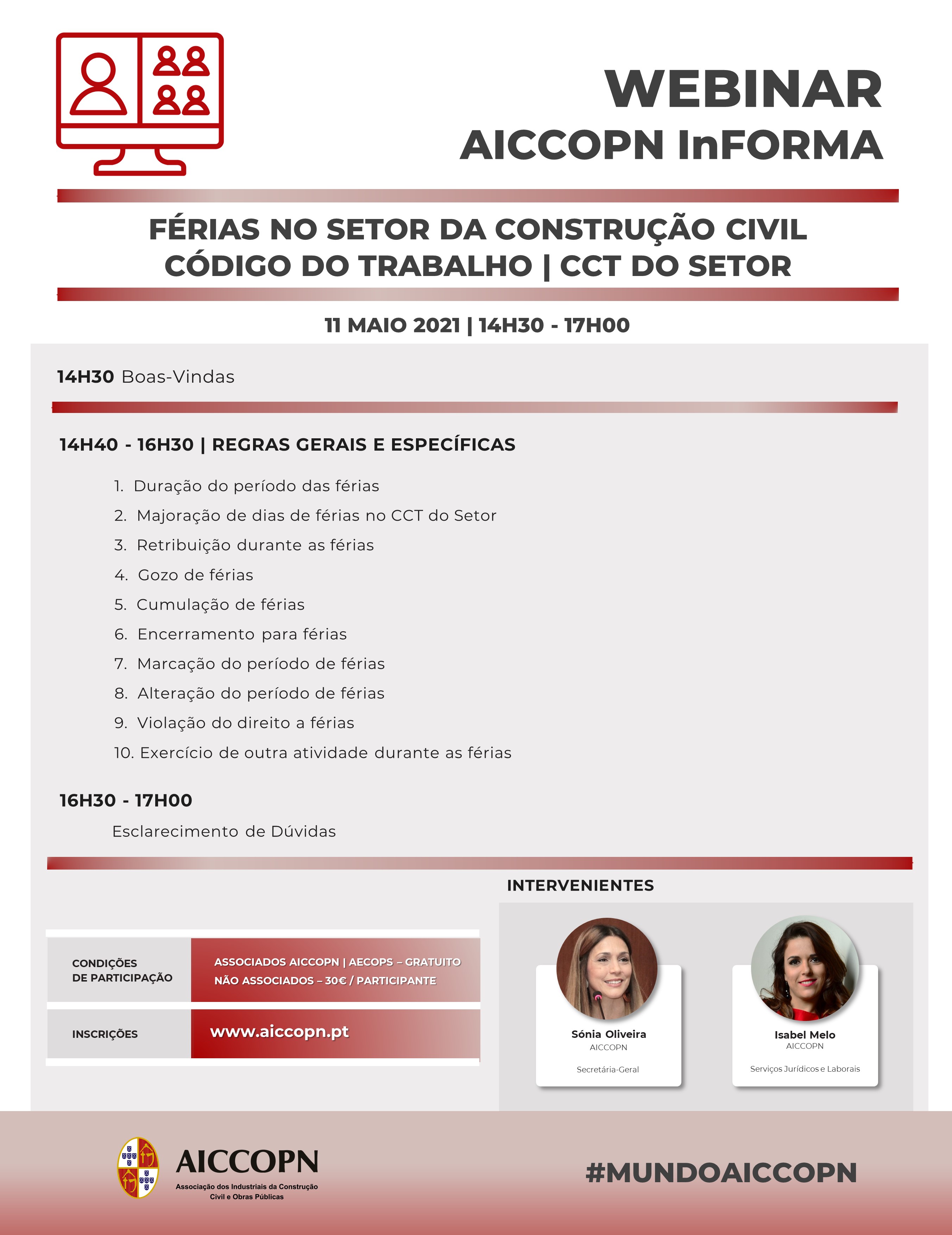 No seguimento do Webinar realizado no passado dia 27 de abril, dedicado ao tema FERIADOS, FALTAS E FÉRIAS NO SETOR DA CONSTRUÇÃO CIVIL | CÓDIGO DO TRABALHO | CCT DO SETOR e, atendendo ao elevado número de manifestações de interesse por parte das Empresas Associadas, a AICCOPN irá promover um novo webinar, agendado para o dia 11 de maio, com o objetivo de esclarecer as Empresas sobre as especificidades do Setor da Construção no âmbito do direito a férias.