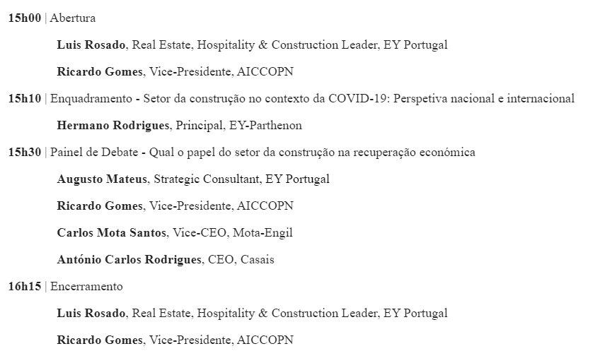 É com este pano de fundo que a EY Portugal, em colaboração com a AICCOPN, realiza o Webinar “Recuperação Económica: Qual o papel do setor da construção”, um fórum de confluência de ideias e de perspetivas sobre o futuro de setor da construção, as respostas necessárias e o estabelecimento de um rumo ainda por definir, a ter lugar no próximo dia 14 de julho, pelas 15h00.