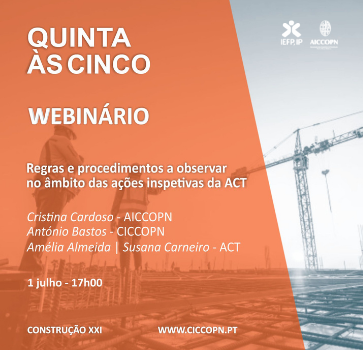 O próximo Webinário do CICCOPN que conta com o apoio da AICCOPN, tem lugar já no próximo dia 1 de julho, às 17 h, no qual serão abordadas diversas questões relacionadas com as ações inspetivas da Autoridade para as Condições do Trabalho (ACT).