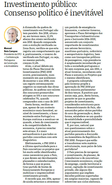Artigo de Manuel Reis Campos, Presidente da CPCI – Confederação Portuguesa da Construção e do Imobiliário, no Público Imobiliário de 06 de fevereiro, disponível para leitura aqui.