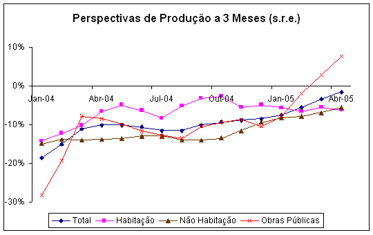 Este novo momento para as empresas de obras públicas faz com que, pelo segundo mês consecutivo, em Abril o indicador de perspectivas de produção para os próximos três meses se situe em terreno positivo (+7,7), subindo 4,8 p.p. face ao mês anterior e 18,3 p.p. desde o começo do ano. Nos dois primeiros meses de 2005 a produção neste segmento de actividade teve variações mensais positivas, de 2,1% e 1,5%, respectivamente [3]. No entanto, em termos homólogos o comportamento ainda é negativo, já que no começo de 2004 a produção de obras públicas também conheceu uma evolução positiva. A confirmarem-se as expectativas dos empresários, a actividade poderá conhecer algum ânimo. Todavia, o outro lado da moeda é que esse comportamento tem as autarquias por catalisador, o que leva a admitir que seja uma evolução sem continuidade a prazo.