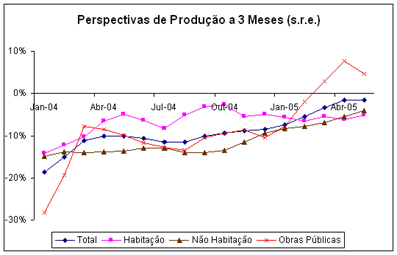 Por sua vez, as empresas com actividade no segmento de obras públicas têm sido o sustentáculo do nível da actividade sectorial, sendo no comportamento deste subsector que se pode encontrar fundamento para a variação do consumo do cimento, mercê de uma ligeira recuperação da produção face ao 4º trimestre de 2004 (+0,1% [4]). O índice de produção publicado pelo INE revela variações mensais positivas no período de Janeiro a Março deste ano. Em contrapartida há uma clara desaceleração do ritmo de novas adjudicações, o que poderá vir a constituir um obstáculo à subida sustentada da produção de obras de engenharia. Isso mesmo parece poder resultar das perspectivas para os próximos 3 meses. Ao contrário dos demais meses de 2005, em Maio as perspectivas de produção reduziram-se (apesar de se manterem em terreno positivo, com um indicador de 4,6%), sendo essa variação corroborada pelas perspectivas de investimento (cujo indicador se situou em -25,6%, perdendo 2,3 p.p face ao mês anterior).
