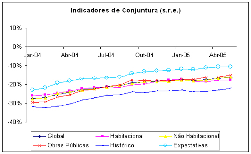 No que respeita às empresas que se dedicam ao segmento habitacional, subsiste um clima de pessimismo, traduzido num indicador global de -17,8%. Isso não constitui surpresa pois mantêm-se das condições de mercado, nomeadamente as relativas ao arrendamento. Relativamente a Abril, a carteira de encomendas não sofreu alterações. Tendo em conta que, face ao último trimestre de 2004, no 1º trimestre de 2005 o número de novas licenças para habitação caiu 3,2% [2], reduzindo-se em 8% [3] o número de novos fogos licenciados, compreende-se que não haja espaço para uma inversão de expectativas. Sendo a insuficiência da procura o principal obstáculo à actividade empresarial (citado por 74% das empresas), são negativas as perspectivas de evolução dos preços para os próximos 3 meses, o que reforça as dificuldades financeiras das empresas. No caso das que se dedicam ao mercado habitacional, o indicador de situação financeira situou-se em -18,8%, 4,8 p.p. abaixo do valor observado no final do ano 2004.