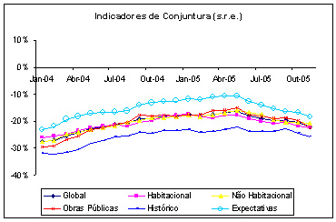 O segundo semestre de 2006 marca o retorno a uma trajectória de agravamento do pessimismo dos empresários da construção civil, tendo o Indicador Global de Conjuntura [1] apurado pela AICCOPN caído 3,9 pontos percentuais (p.p.) desde Junho deste ano. Esse movimento é ainda mais acentuado no caso das expectativas futuras, cujo indicador, em igual período, teve uma queda de 5,7 p.p.. Este comportamento do sentimento económico dos empresários é relevante, pois resulta de uma série de 5 meses consecutivos de perda de expectativas quanto ao futuro próximo, depois de este indicador ter registado uma série de 26 meses quase sempre em movimento ascendente (exceptuam-se três meses).
