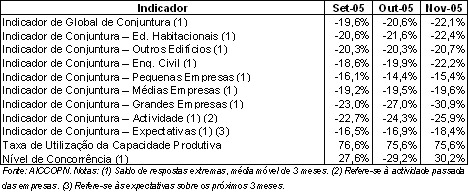 A justificação essencial para esta inversão encontra-se na persistência da queda abrupta das perspectivas de produção futura no segmento de obras públicas. Se em Abril deste ano os empresários com actividade nesse segmento tinham expectativas que elevavam o respectivo indicador para +7,7%, em Novembro esse mesmo indicador encontra-se em -26,4%, ou seja, -34,1 p.p. em apenas 8 meses. Nos demais segmentos o comportamento também é negativo. Porém, é-o numa escala menos gravosa.