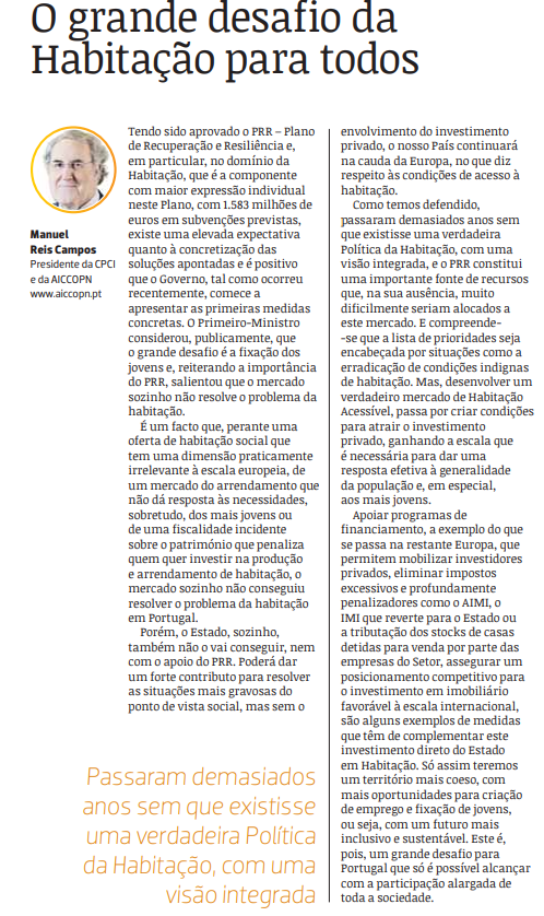 Artigo da CPCI e da AICCOPN na edição do Público Imobiliário desta semana, disponível para leitura aqui