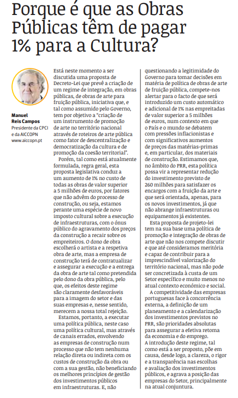 "(…) tal como está atualmente formulada, regra geral, esta proposta legislativa conduz a um aumento de 1% no custo de todas as obras de valor superior a 5 milhões de euros, por fatores que não advêm do processo de construção, ou seja, estamos perante uma espécie de novo imposto cultural sobre a execução de infraestruturas, com o ônus público do agravamento dos preços da construção a recair sobre os empreiteiros. O dono de obra escolherá o artista e a respetiva obra de arte, mas a empresa de construção terá de contratualizar e assegurar a execução e a entrega da obra de arte tal como pretendida pelo dono da obra pública, pelo que, os efeitos deste regime são claramente desfavoráveis para a imagem do setor e das suas empresas e, nesse sentido, merecem a nossa total rejeição (…)