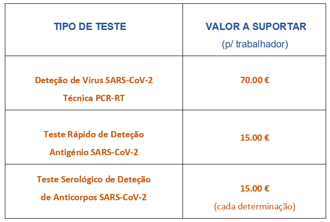 Dado o agravamento da crise sanitária que vivemos e face à necessidade que nos tem sido reportada pelas empresas de promoverem, com maior incidência, a realização destes testes aos seus trabalhadores, acordamos com a UNILABS, melhores condições para os Senhores Associados, que passamos a informar no quadro: