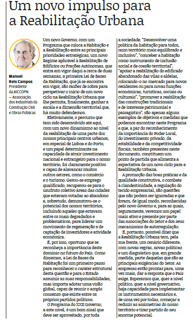 " Um novo Governo, com um Programa que coloca a Habitação e a Reabilitação entre as principais prioridades estratégicas, um novo Regime aplicável à Reabilitação de Edifícios ou Frações Autónomas, que entra em vigor daqui a cerca de duas semanas, a primeira Lei de Bases da Habitação, que já se encontra em vigor, são razões de sobra para perspetivar o início de um novo ciclo na Reabilitação Urbana que lhe permita, finalmente, ganhar a escala e a dimensão territorial que, há muito defendemos (…)."